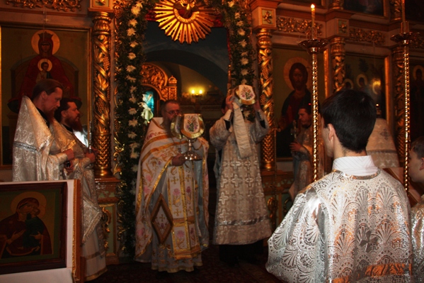 Богослужение в день тезоименитства наместника обители14 Января 2011 года. Праздник Обрезания Господня и святителя Василия Великого – святого покровителя отца наместника. Поздравить игумена Василия приехали священнослужители и братия с монастырских подворий и прихожане Алатырского Иверского храма, в котором служил настоятелем отец Василий. По окончании праздничного молебна святителю Василию Великому произнес слово отец наместник. Затем присутствующие поздравляли именинника с Днем тезоименитства. От братии обители поздравил благочинный игумен Мануил. Чествовали отца Василия прихожане Иверского храма Алатыря и храма Святой Троицы подворья монастыря в с. Б. Сундырь. А такж игумения Сергия – настоятельница Чебоксарского Спасо-Преображенского женского монастыря и монахиня Нина – настоятельница Цивильского Тихвинского женского монастыря. Руководитель Воскресной школы при нашей обители – С. Л. Клементьев с учащимися. Наставники и дети Чебоксарского детского дома, который опекает монастырь.